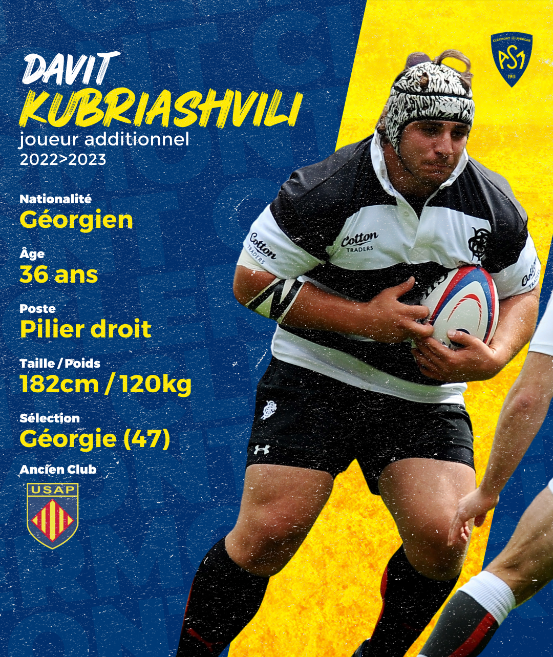 Les dirigeants auvergnats ont trouvé un accord avec l’international géorgien Davit Kubriashvili (36 ans, 1m83, 120kg) afin d’intégrer dès aujourd’hui l’entrainement avec les Jaune et Bleu. Passé par Toulon, Montpellier, Paris, Grenoble et Perpignan, c’est un joueur qui connaît parfaitement le championnat et dispose d’une solide réputation qui intègre le pack clermontois pour les prochains mois afin de compenser l’absence de Rabah Slimani (opéré récemment d’une désinsertion du biceps) dans un premier temps, avant de densifier le groupe pour le reste de la saison. Il sera en soutien de Cristian Ojovan et des jeunes Valentin Simutoga et Giorgi Dzmanashvili dont il accompagnera le développement. En fin de contrat avec Perpignan, Davit s’est préparé individuellement tout au long de l’été dans l’attente d’une nouvelle opportunité. C’est à Clermont qu’elle se présente pour le solide pilier géorgien.