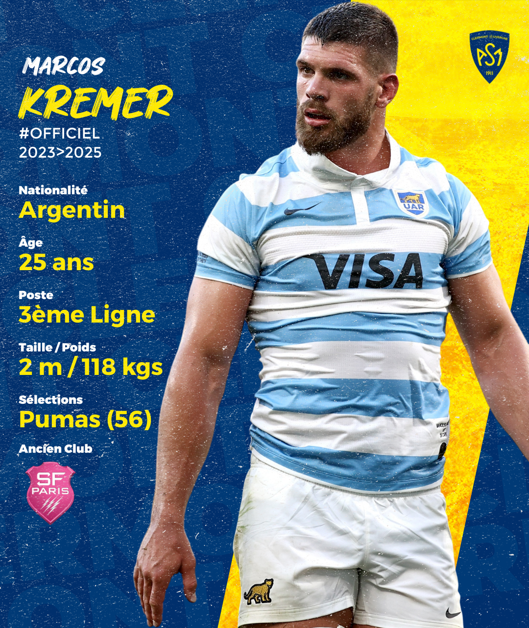 Les dirigeants clermontois viennent de réaliser un gros coup sur le marché des transferts puisqu’après les internationaux tricolore, Mohamed Haouas, le all-black, Pita-Gus Sowakula, et l’australien, Folau Fainga’a, c’est une nouvelle pointure mondiale qui vient de s’engager avec l’ASM Clermont Auvergne en la personne de l’Argentin Marcos Kremer. Le très solide Puma qui compte déjà 56 sélections à 25 ans seulement est capable d’évoluer à la fois en seconde ligne et en troisième ligne grâce à un physique massif (2m pour 118 kg) et des capacités physiques hors-normes. Ce très rude combattant, sélectionné avec les Pumas à l’âge de 19 ans fait partie des joueurs cadres de la sélection argentine avec laquelle il a participé à toutes les éditions du Rugby Championship depuis 2016. Il fut notamment un acteur essentiel de la victoire historique des Pumas chez les All-Blacks en aout 2022 sur la pelouse de Christchurch (18-25). Sélectionné par Mario Ledesma pour participer à la dernière Coupe du Monde au Japon, il a disputé les quatre matches des Pumas dans cette compétition et devrait logiquement participer à la prochaine en France en septembre 2023. Il ne devrait ainsi rejoindre les Jaune et Bleu qu’à la fin de la compétition avant de débuter sous ses nouvelles couleurs jusqu’en juin 2025 (option 2026).