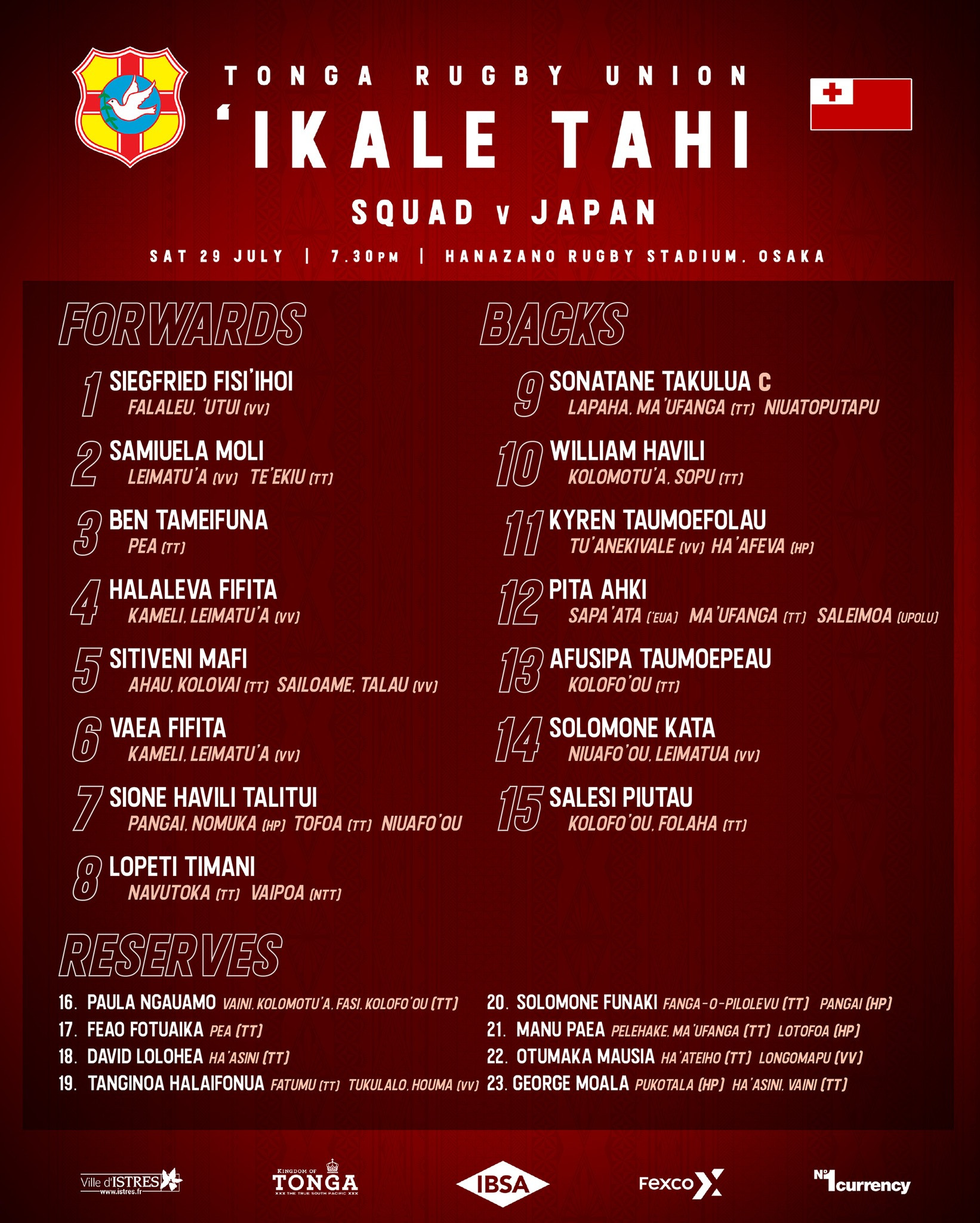 De son côté, George Moala disputera son premier match en sélection lors de cette préparation à la Coupe du Monde lors du déplacement des Tonga au Japon. Le centre clermontois débutera sur le banc pendant le milieu du terrain des Tonga débutera avec une paire Akhi (Toulouse) – Taumoepeau (USAP).