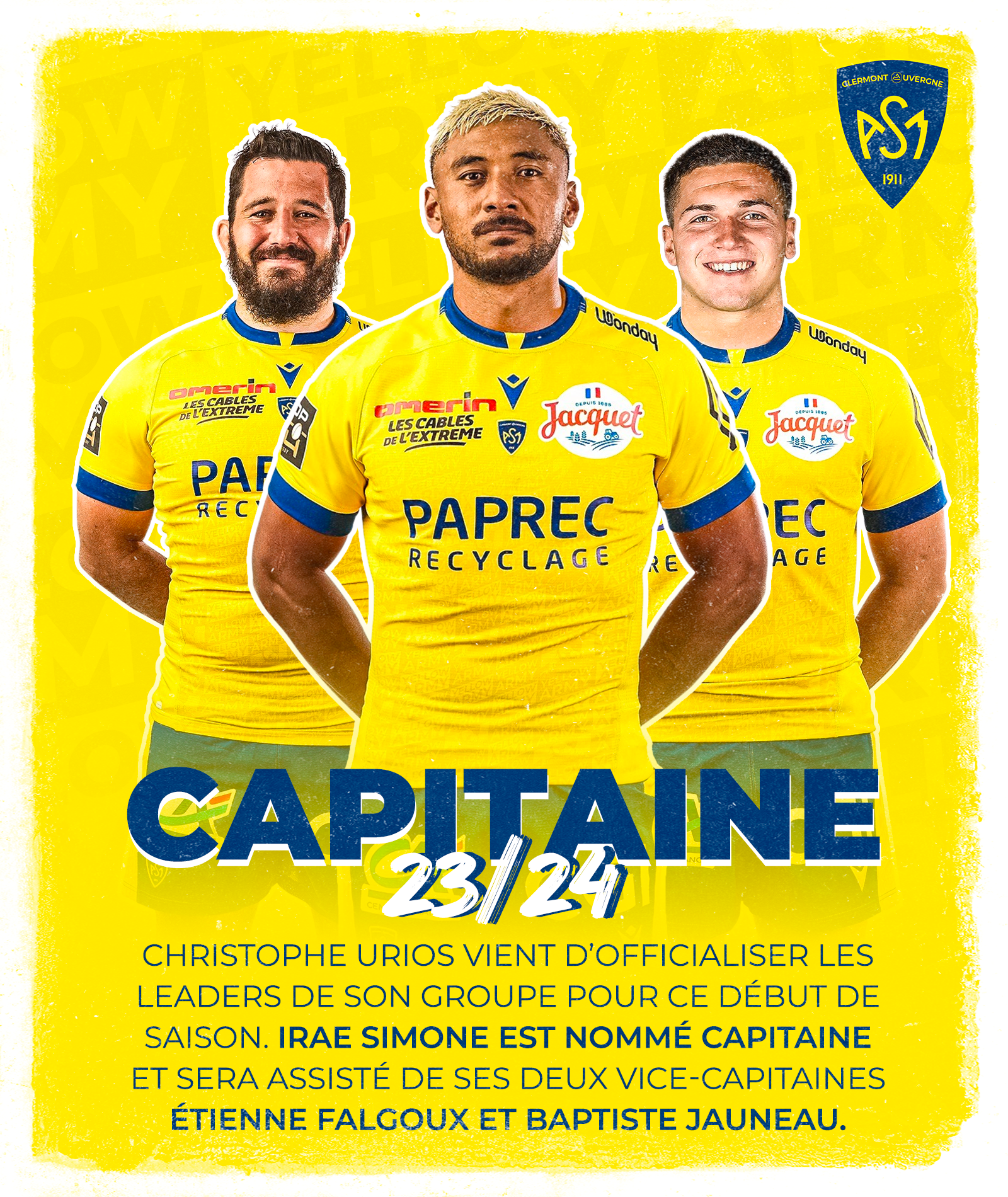 Christophe Urios et son staff ont décidé de nommer Irae Simone capitaine des Jaune et Bleu pour ce début de saison. L’international australien, Irae Simone, qui occupait déjà cette fonction lors des matchs de préparation est confirmé dans son rôle et sera assisté par Etienne Falgoux et Baptiste Jauneau, tous les deux vice-capitaines de l’équipe pour ce début de saison.